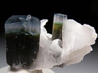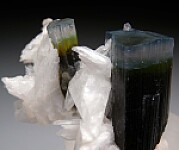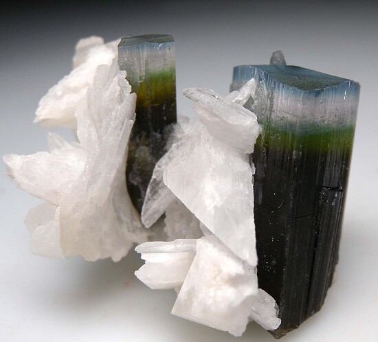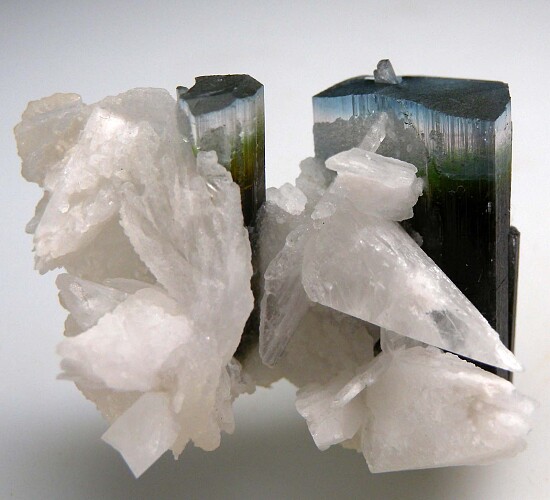 Two blue-cap Tourmaline crystals with attached Albite and Hambergite crystals. The Tourmaline crystals grade up from dark green, to medium green, to colorless to slightly lavender, and finally to blue terminations. The backside has numerous attached white Hambergite crystals to 1.7cm. Undamaged and not your average Stak Nala Tourmaline!! Ex. Neil Levett collection, acquired by Neil in 2013.