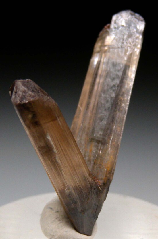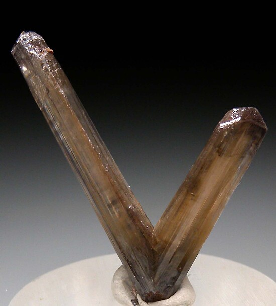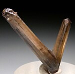 Single V-twin Cerussite crystal from recent finds in the Republic of Congo. The longer 'arm' is 3.4cm long. It's complete and well crystallized all around, undamaged with just a tiny point of contact at the very bottom.