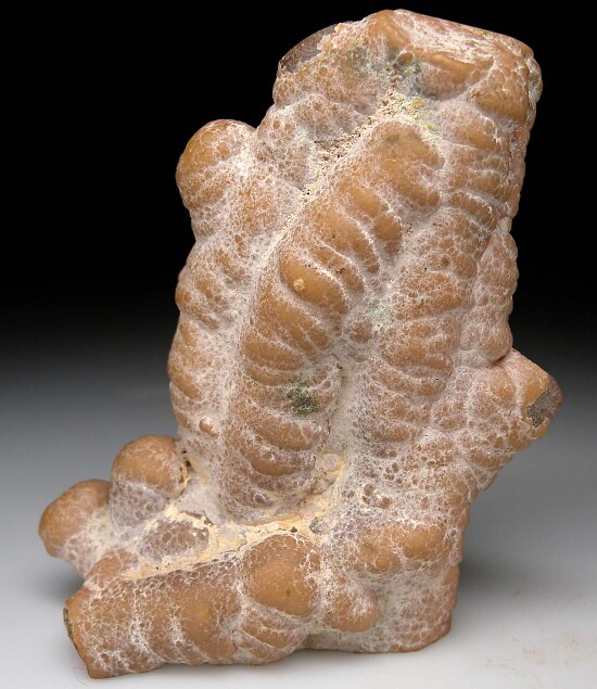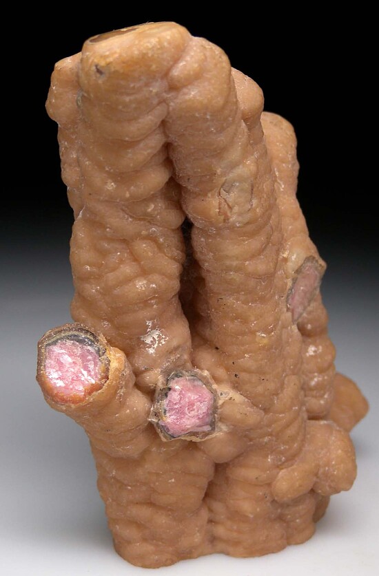 Interconnected stalactites of Rhodochrosite from the Capillitas Mine. This is a tight bunch of numerous stalactites all grown together, with some of the ends broken revealing the internal concentric rings of varying shades of pink and red. The bottom is cut smooth and the cluster stands upright on it's own for display. It's 8cm tall and could be cut into a number (8?) of great slabs, therefore I value this at $500 in rough value alone.