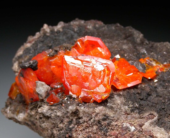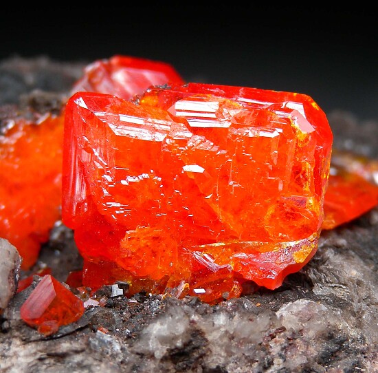 Bright red/orange, lustrous Wulfenite crystals on matrix. This is a visual striking specimen with a 2cm central crystal that stands up on edge for maximum visual appeal.