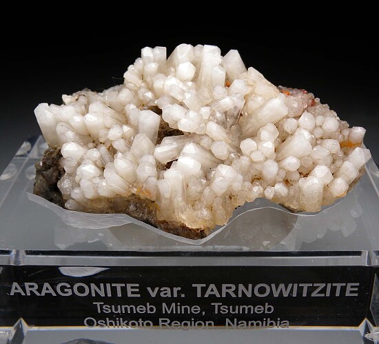 Wide specimen loaded with white crystals of the zincian-rich Aragonite known as Tarnowitzite. The crystals are translucent, in excellent condition, and average about 1cm in size. Ex. Alex Neufeld, Wilhelm Kegel, Erika Pohl-Strohler collections. Comes with a custom Lucite display stand.
