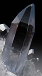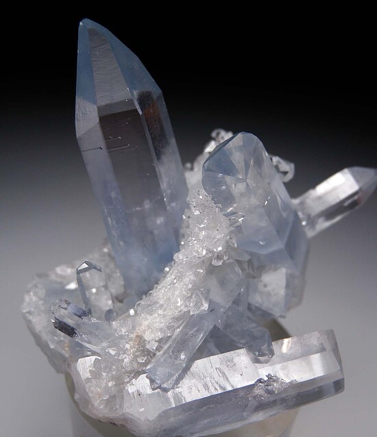 Transparent blue crystals of Celestite on matrix. These are found in geodes, but this one is about as opposite-looking as a geode as you could imagine, with a mounded matrix covered with elengated crystals sticking out in all directions. The main crystal is 4.5cm tall, transparent, and perfect. Note that the only contact is on the side of a back crystal as seen in photos, and although this crystal has a more flat than pointy termination, it is a good undamaged termination. Visually striking specimen from the Paul Geffner collection.