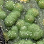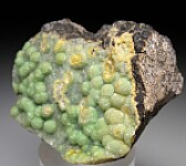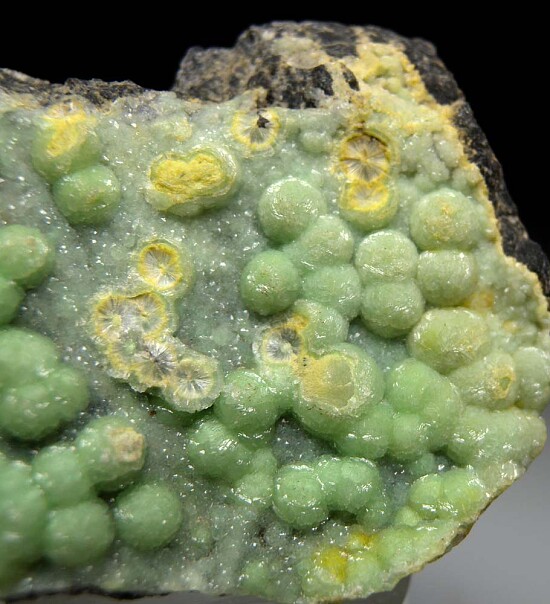 Bright lime green hemispheres of Wavellite on matrix. Larger hemispheres of more lime green Wavellite cover a sparkly druse of more blue/green Wavellite that coats the matrix. Some are incomplete and show the radial crystal structure within. Nice example!