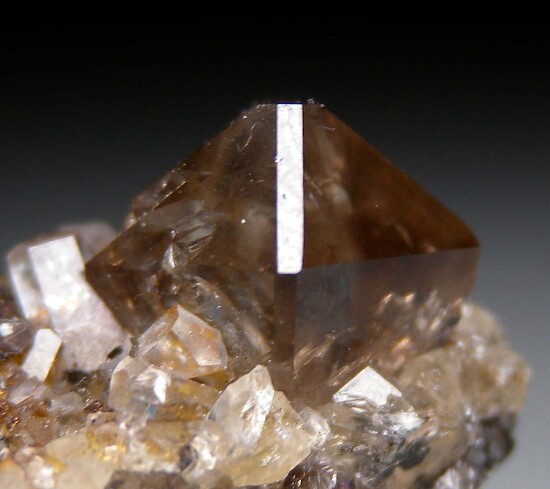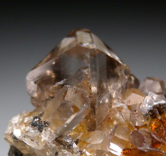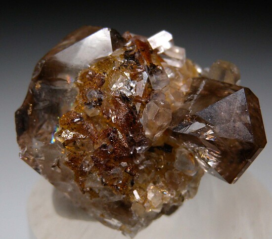 Smokey Quartz crystals and elongated clear Calcite crystals from an obscure Canadian locality. The Quartz are highly lustrous and transparent with the best a doubly-terminated 'beta' style crystal.