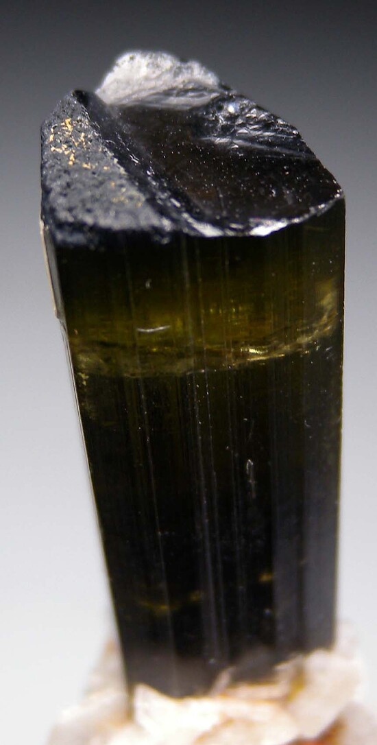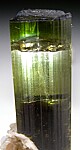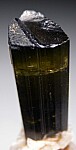 Thick single green gem Tourmaline crystal with attached Albite. This is an older specimen with a much thicker (1.3cm) crystal diameter than more recent finds, and it's also highly transparent for about half of it's length (not just the tip, which is more common for this locality). Complete all around and undamaged and has on old collection sticker affixed to one side. The termination has stepped elevations but is undamaged. This is not your typical Stak Nala - thicker and gemmier than most, the difference is obvious in person. Valued at $300+.