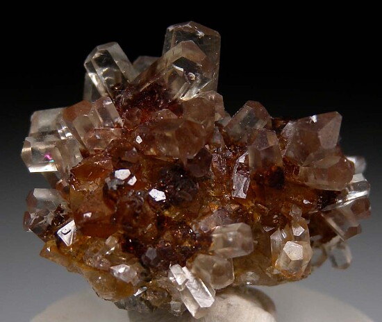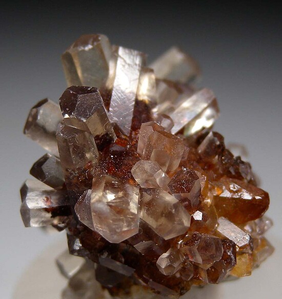 Clusters of elongated clear Calcite crystals from an obscure Canadian locality. The Calcite are transparent and in excellent condition and project out in all directions from a mound-shaped matrix.
