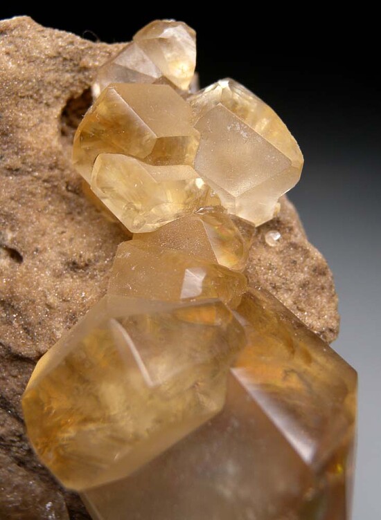 Classic honey-colored Calcite crystals from North Vernon, Indiana. These distinctive crystals have a mixture of glassy and matte surface luster and good transparency. Crystals reach 3cm in size.
