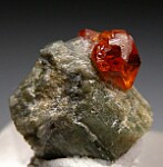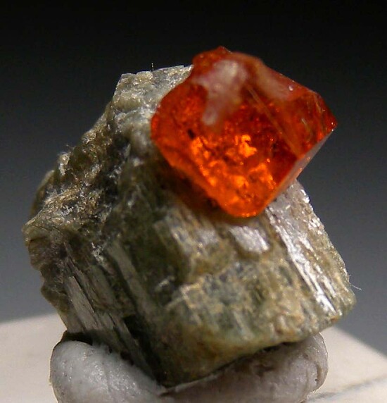 Sharp red orange Grossular crystal atop a green Diopside crystal. The Grossular is gemmy and mostly complete with an indent on top where another crystal grew. Rare and classic USA specimen from a defunct locality.
