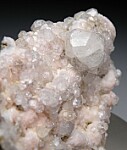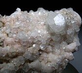 Glassy, transparent Analcime crystals on matrix. The main crystal is 1.3cm with dozens of smaller, sparkling Analcime crystals over a pink Calcite covered matrix.