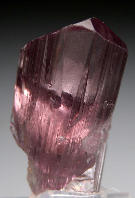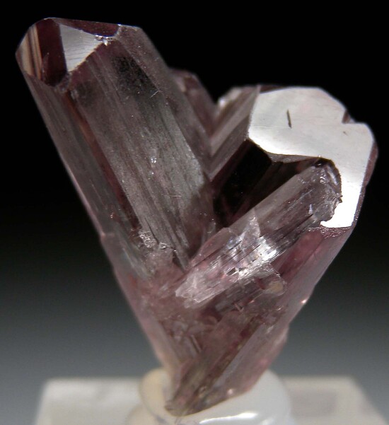 V-twin crystal of color change Diaspore. From recent finds in the mountains near Pinarcik, these new Diaspore crystals are spectacular in color and form. Glassy, flat termination faces on both 'arms', complete and undamaged. Gem quality and transparent inside, much more glassy and transparent in person. Medium purple color in natural sunlight. Most of these V-twin crystals are in the 1 to 1.5cm size range and this one is considered large.