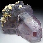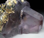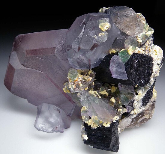 Two large, transparent purple, twinned Fluorite crystals intergrown at an angle. The back is coated with large black Schorl, green Fluorite, and yellow Muscovite crystals. Large and impressive crystals from recent finds. Stands upright on it's own for display.