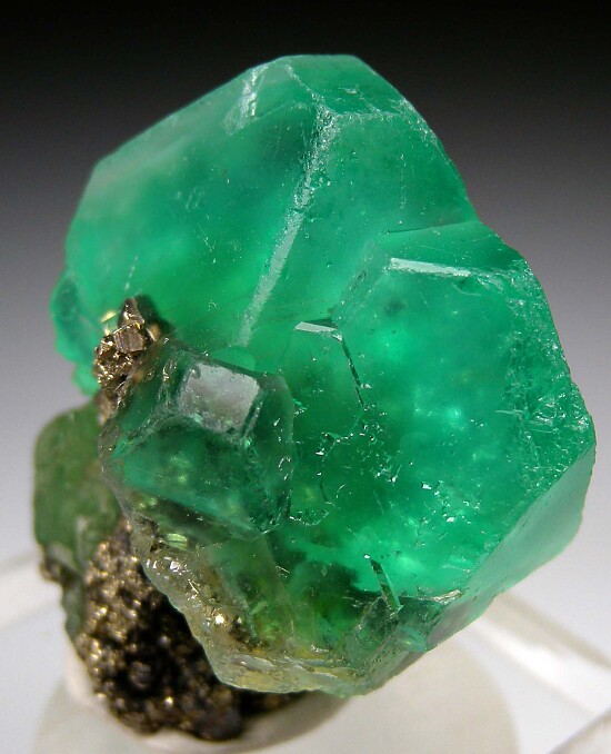 Vivid emerald-green Fluorite crystals with attached Pyrite. The main crystal is 2.5cm in size and transparent.