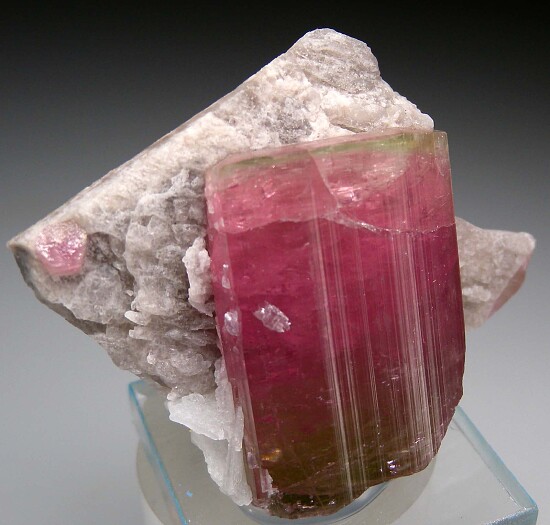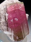 Pink and green Tourmaline crystal, 3.2cm tall, attached to grey Feldspar. The Tourmaline is undamaged and you can see right through it to the Feldspar in some areas. Minor amounts of white Albite and pink Lepidolite are attached.
