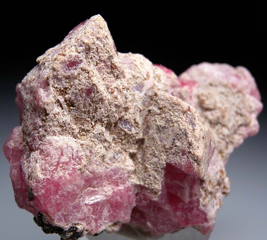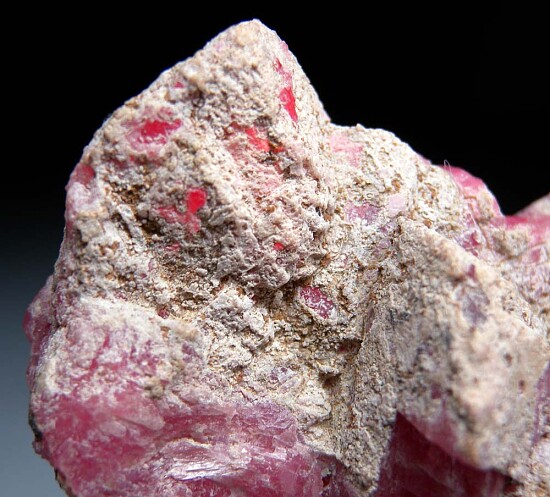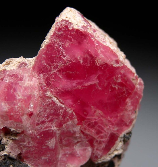 Translucent pink/red Rhodochrosite crystals from Colorado. Aside from a small amount of sulfides on the base, this is nothing but solid crystals!! The front side has a light whitish coating (that could possibly be removed) but the bright translucenty shows through. Individual crystals reach 3cm in size. Ex. Dr. Steven Morehead collection.