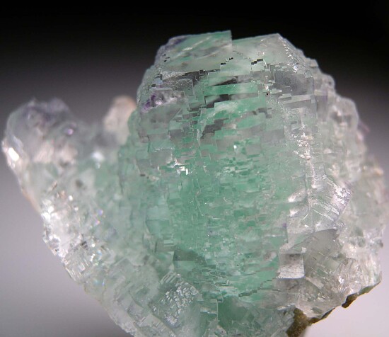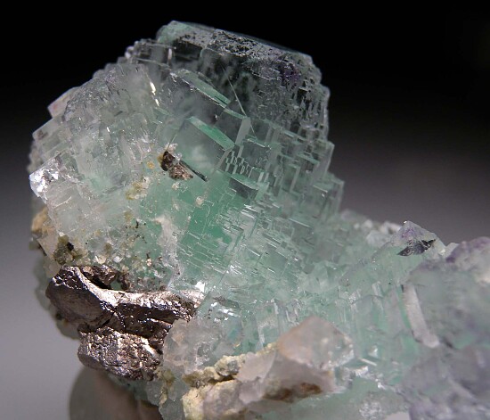 Transparent green cubic Fluorite in a neat stepped growth formation. Well crystallized all around with attached Arsenopyrite crystals. Ex. Dr. Steven Morehead collection.