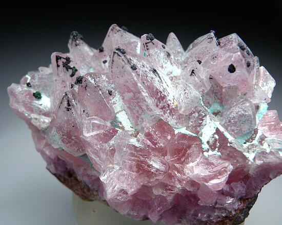 Spikey, scalenohedral pink Cobaltian Calcite crystals. The crystals are bright translucent pink with an outer layer of lighter to colorless, transparent Calcite. The first generation of Calcite was partially coated by blue Chrysocolla before the second generation of Calcite, and is therefore included within the Calcite. Finally, the crystals have attached specks of Malachite and grey sulfide minerals.