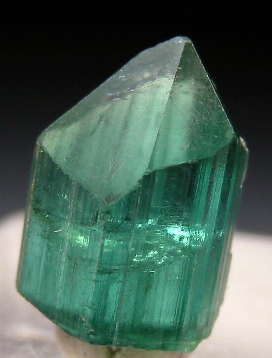 Transparent, gem quality blue/green Tourmaline crystal with a pointed termination. Undamaged, fine quality gem crystal. Mined in the 1908-1910 time period while the site was operated by the Maine Feldspar Co.