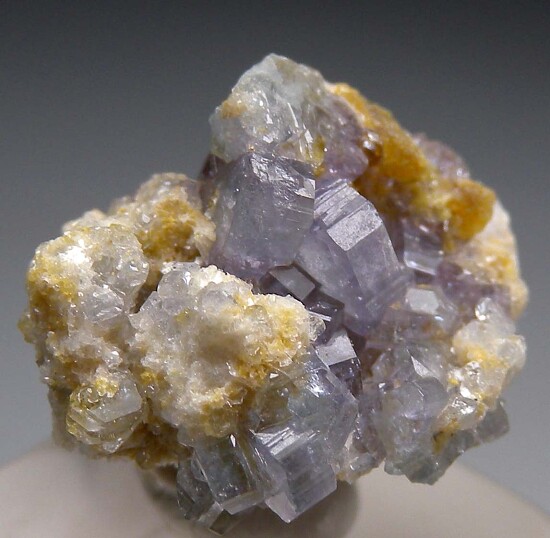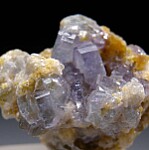 Cluster of glassy, purple/blue Apatite crystals with Bertrandite. The Apatite crystals are tabular and reach 5mm wide.
