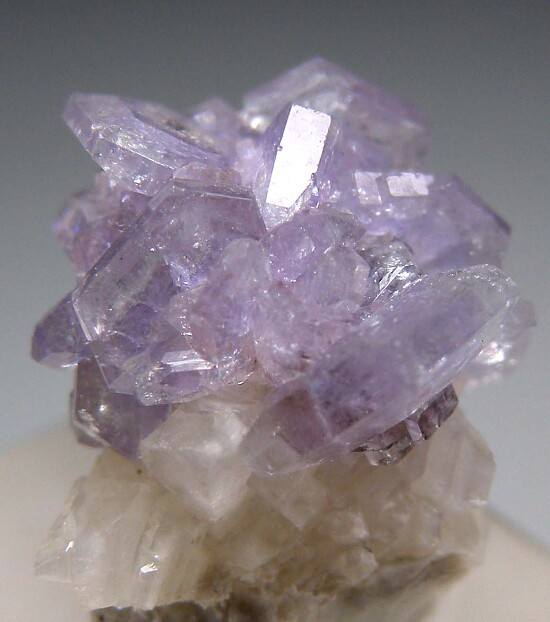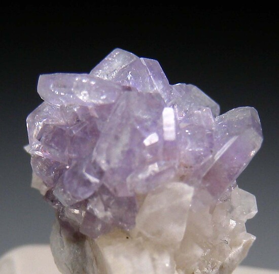 Glassy purple Apatite crystals in an aesthetic cluster on Albite. The Apatite crystals are tabular and reach 4mm wide.
