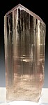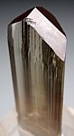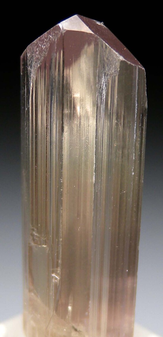 Well terminated, untwinned single Diaspore crystal. Transparent with a golden body color, vertical striations and flat, lustrous termination faces. Complete all around and in excellent condition with a small nick on a back termination edge as seen in last photo. Note that Diaspore is dichroic, changing between golden and purple tones in different lighting. This crystal appears more golden colored to my eyes, but the camera is picking up some of the purple tones.