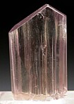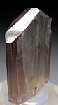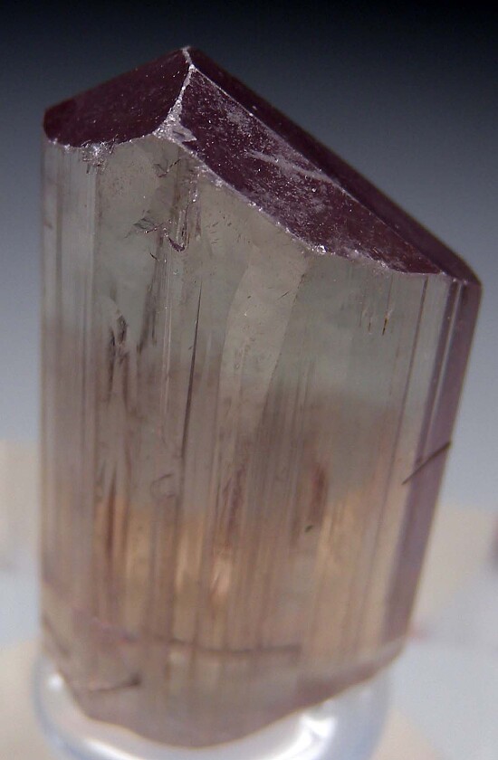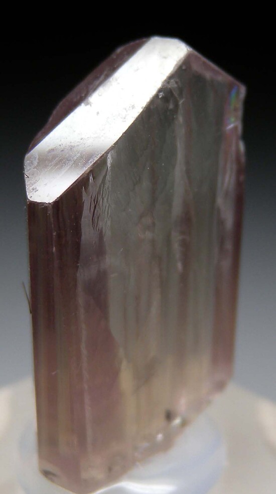 Well terminated, untwinned single Diaspore crystal. Transparent with a golden body color, vertical striations and flat, lustrous termination faces. Complete all around and in excellent condition. Note that Diaspore is dichroic, changing between golden and purple tones in different lighting. This crystal appears more golden colored to my eyes, but the camera is picking up some of the purple tones.