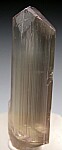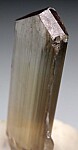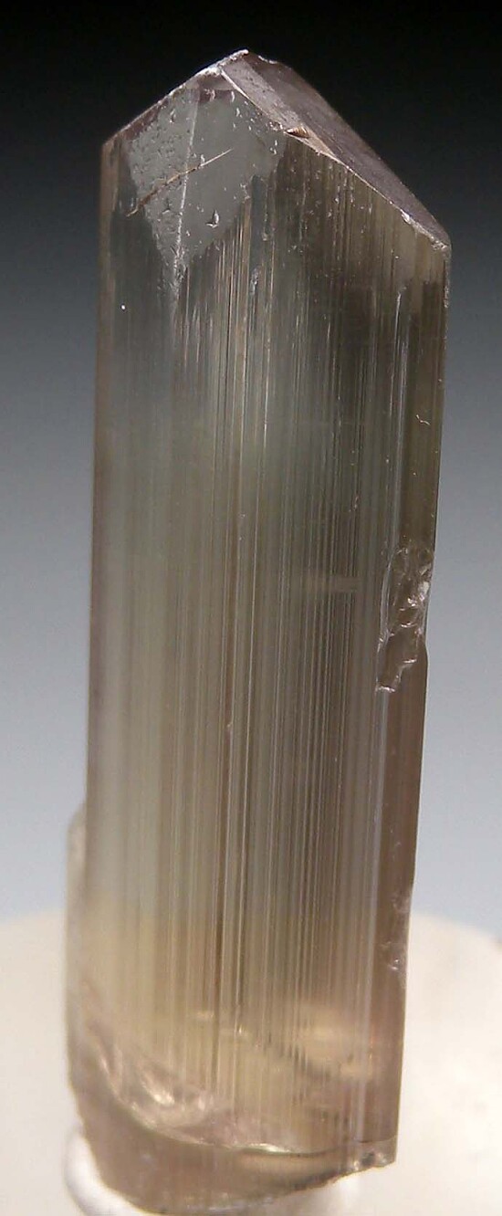 Well terminated, untwinned single Diaspore crystal. Transparent with a golden body color, vertical striations and flat, lustrous termination faces. Complete all around and in excellent condition. Internally flawless but with some edge chipping. Note that Diaspore is dichroic, changing between golden and purple tones in different lighting. This crystal appears more golden colored to my eyes, but the camera is picking up some of the purple tones. Fine and rare gem crystal valued at $400.