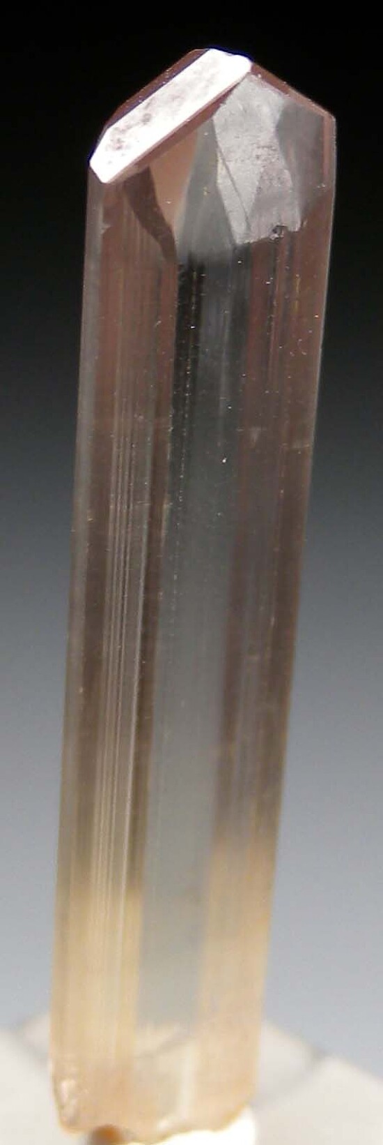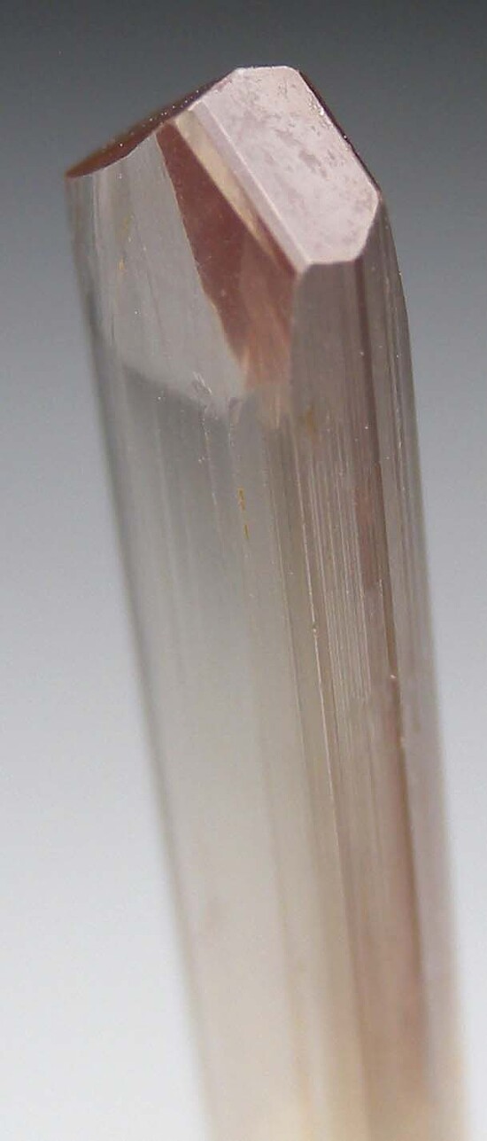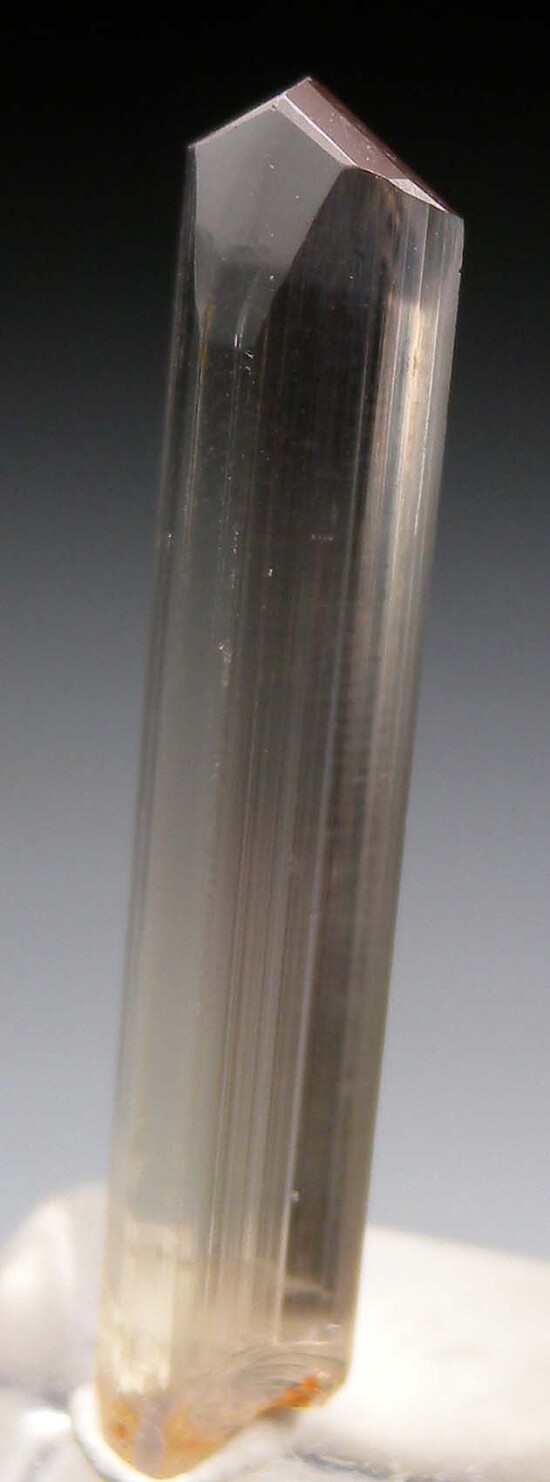 Well terminated, untwinned single Diaspore crystal. Transparent with a golden body color, vertical striations and flat, lustrous termination faces. Complete all around, undamaged, and internally flawless. Note that Diaspore is dichroic, changing between golden and purple tones in different lighting. This crystal appears more golden colored to my eyes, but the camera is picking up some of the purple tones.