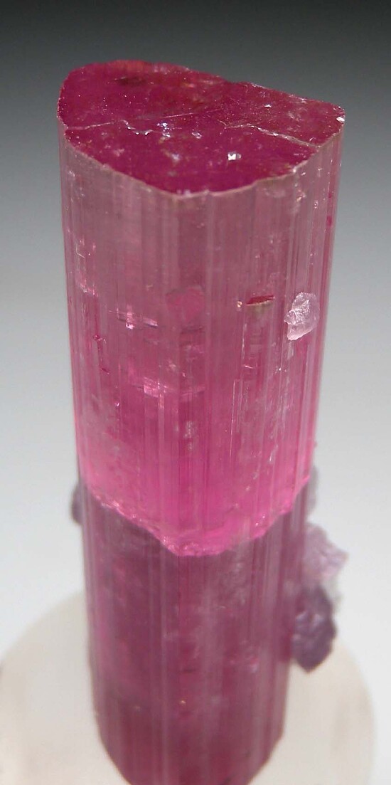 Bright 'bubble-gum' pink Tourmaline crystal from the Himalaya Mine in California. The Tourmaline is undamaged, translucent, and entirely pink with a very thin green zone at the termination. Crystals of white Albite and pink Lepidolite are attached. Weighs 28.94 grams.