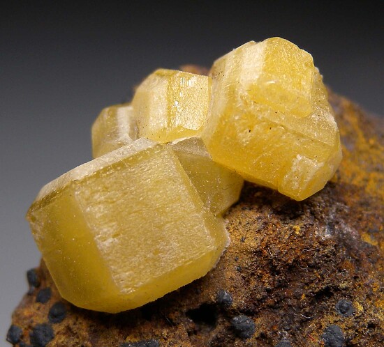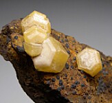 Translucent yellow crystals of Mimetite on matrix. Aesthetic, well isolated crystals to 9mm in width. The specimen has an old collection number affixed to the backside and comes with a couple old dealer labels indicating it was mined in the 1960s. Undamaged.