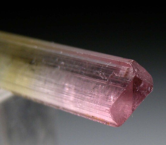 Doubly-terminated pink and green Tourmaline crystal from the Himalaya Mine in California. The Tourmaline is undamaged and transparent. Weighs 2.34 grams. Ex. Dr. Steven Morehead, Don Zowader collections.