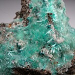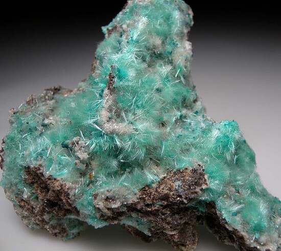 Sprays of blue/green Auricalcite and small areas of Rosasite covering matrix. This is an uncommon specimen from a defunct and obscure Arizona locality (not to be confused with the 79 Mine!). This was collected decades ago by Gene Schlepp from the 49 Mine, and not the adjacent Chief Mine which works the same vein system. Ex. Dr. Steven Morehead collection.
