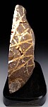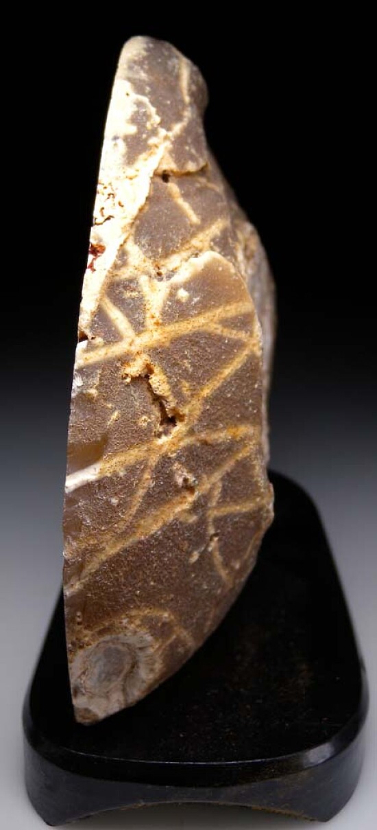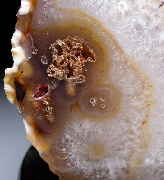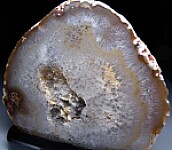 Cut and polished nodule of Brazilian agate with a hollow cavity in the center. Bands of Agate and radial clusters of Quartz crystals can be seen in various areas of the alrge display face. A nice decorator specimen for home or office. Comes mounted on a black display stand.