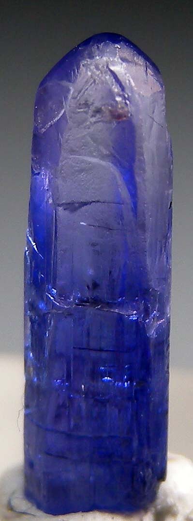 Single blue Tanzanite crystal with an unusual 'melted' appearance that reminds me of a Jeremejevite crystal. Undamaged with great transparency. Natural, complete, unheated gem crystal. Weighs 1.39 carats.