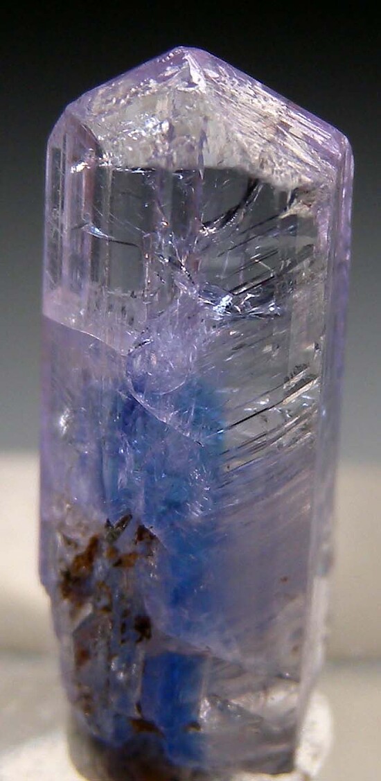 Glassy gem quality lavender/pink Zoisite crystal (pink Tanzanite). Tall crystal with a pinkish color for most of the crystal with a blue zone running up the middle. Complete all around. Natural, unheated gem crystal. Weighs 4.62 carats.