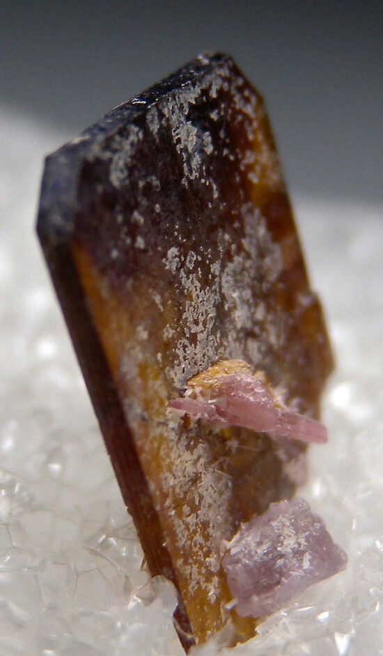 Single Stibiotantalite crystal from the Himalaya Mine with attached pink Tourmaline and Lepidolite. Translucent, yellow/brown in color and undamaged (could be improved with cleaning). Ex. John Dabney collection.