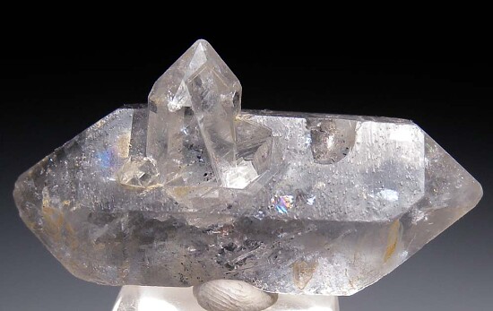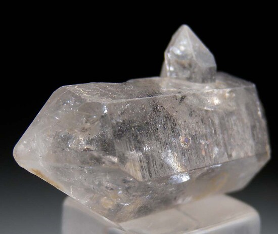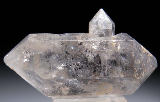 Doubly-terminated Quartz crystal from early finds in the Jinkouhe District of China. Well crystallized all around floater specimen with a small side crystal and black carbon inclusions. Old specimen from the John Dabney collection.
