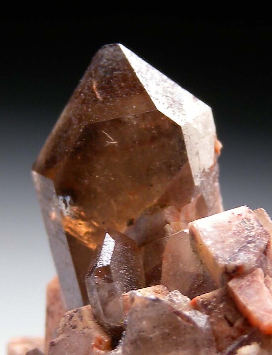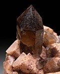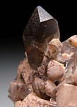 Transparent Smokey Quartz crystals on pink Microcline (Feldspar). Displays very nicely with a tall upright Smokey. Largest crystal is 2cm and perfect.