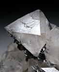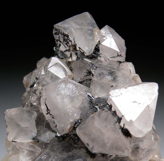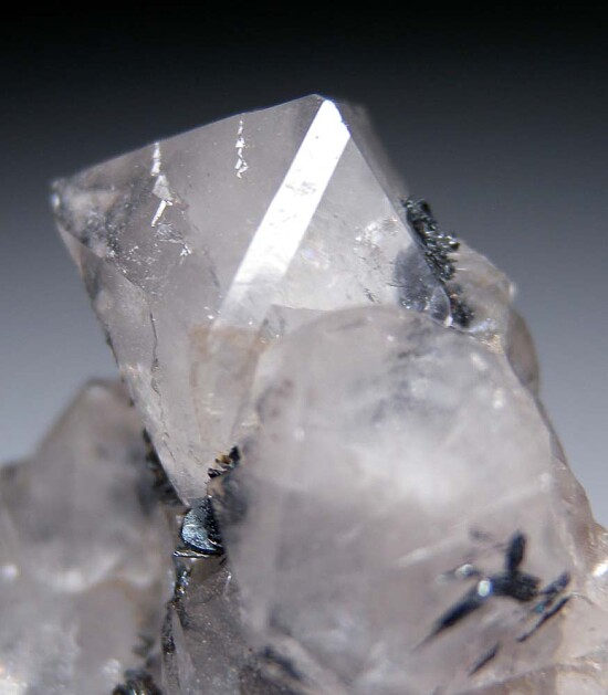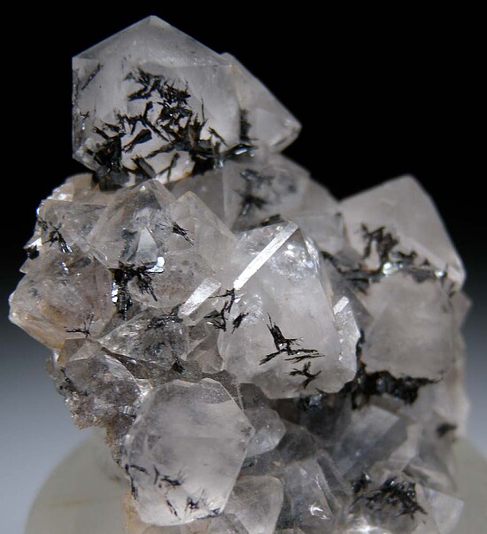 Black Hematite crystals atop glassy, bi-pyramidal Quartz crystals. The Quartz are sharp and transparent and reach 1.5cm wide. Showy old classic in excellent condition and valued at $200.