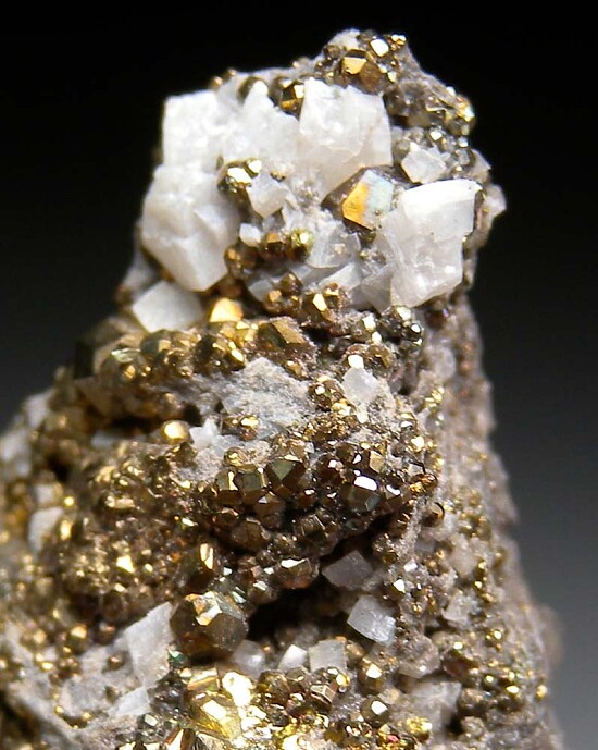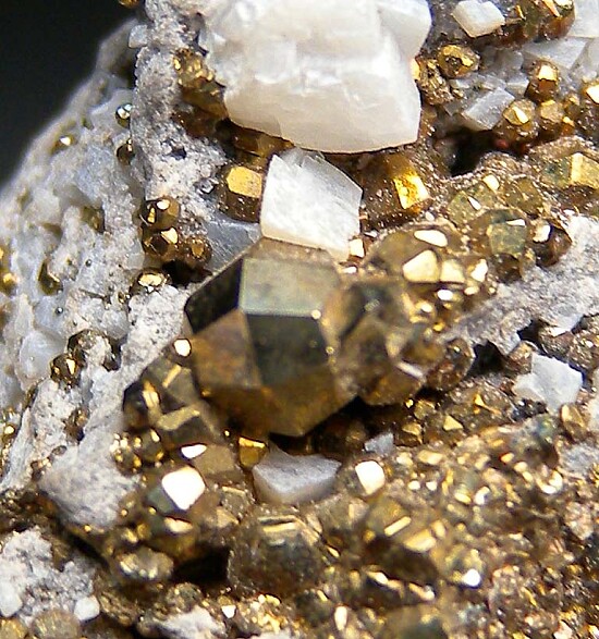 Brassy Pyrite crystals and white Calcite on matrix. The Pyrite form distinct trapezohedral crystals, different than the typical cubes or octahedrons. Nice crystals and neat locality piece from an old Dolostone quarry.