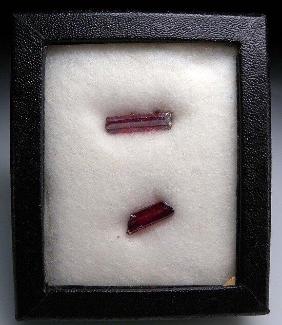 Two crystals of bright cherry-red, transparent Proustite. The crystals are 1.8 and 1.3 cm in size and have obviously been kept in the dark as they are bright and transparent without need of backlighting. Neither are well terminated. Come displayed in a Riker mount.