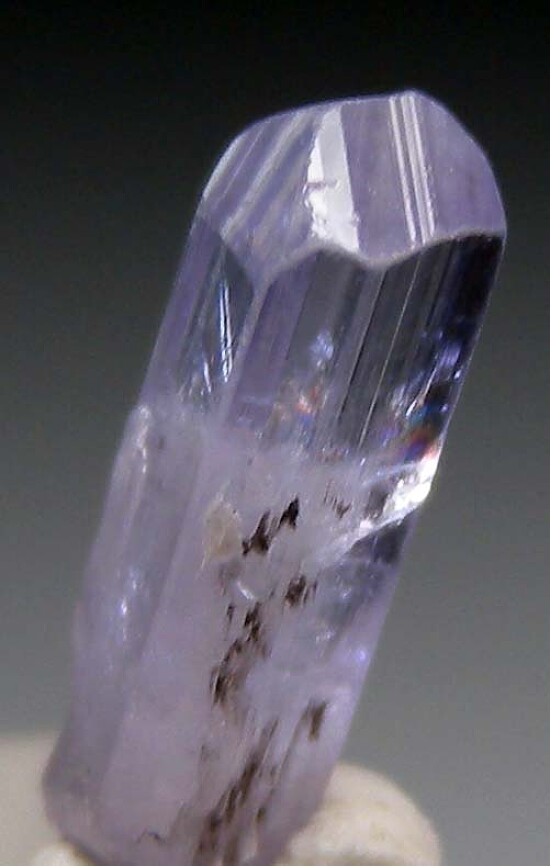 Transparent single Tanzanite crystal, fully transparent and glass-like in the upper half. Complete and undamaged with a lavender coloration. Natural, unheated Tanzanite crystal.