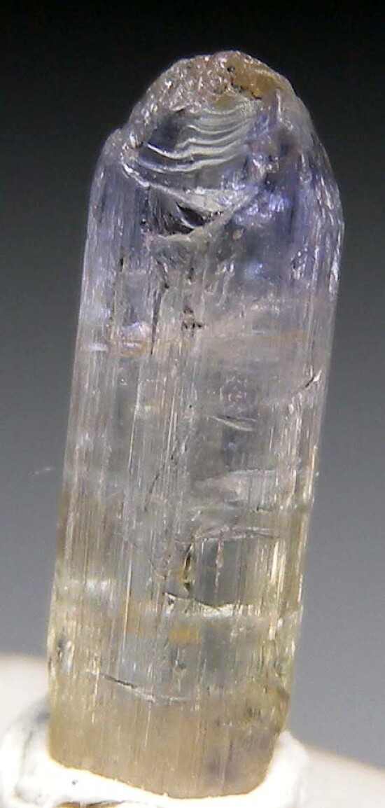 Transparent single Tanzanite crystal from Tanzania. A tall, slender bi-colored crystal, blue over yellow. Natural, unheated Tanzanite crystal.