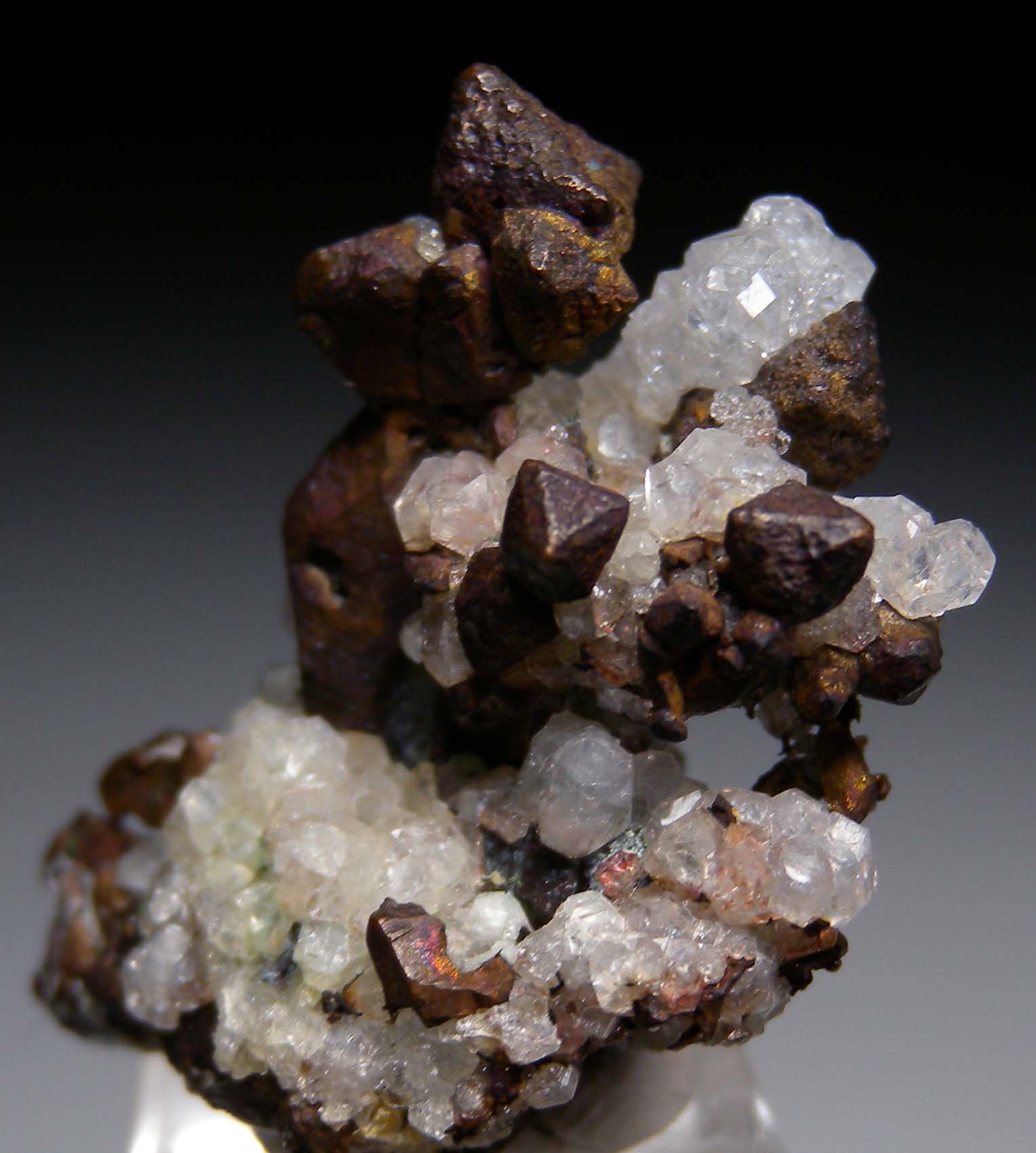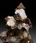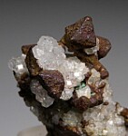 Octahedral Copper crystals associated with sparkling white Analcime crystals. Octahedral Copper crystals are rare and this one has a number of them, largest 6mm in size.