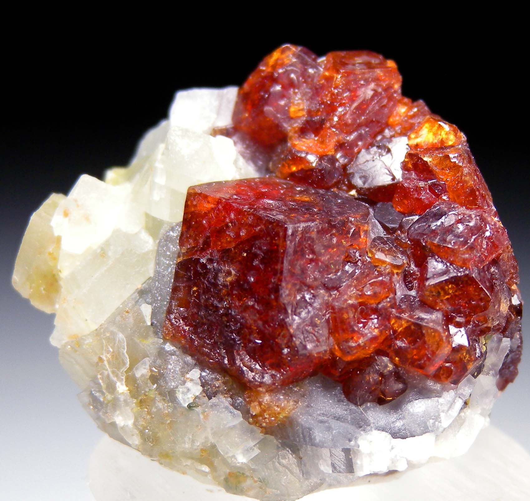 Red/orange Grossular crystals in Calcite. The central Grossular crystal is 1.5cm wide.
