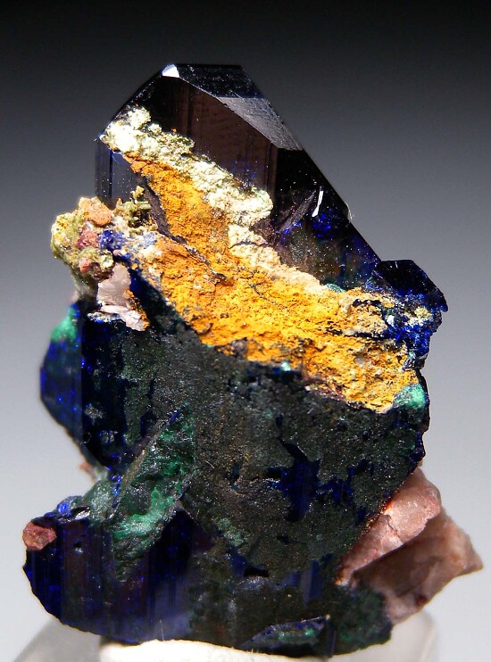 Terminated single blue Azurite crystal partially pseudomorphed to Malachite.