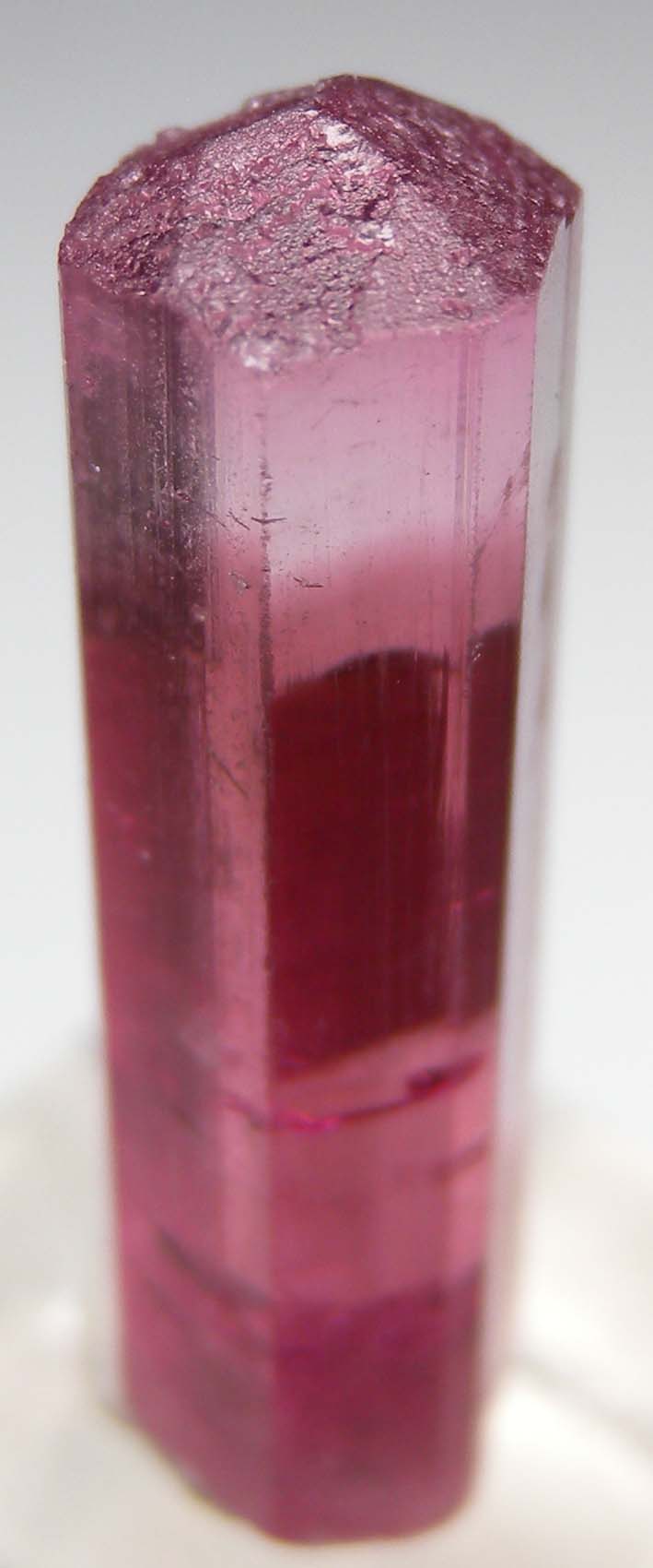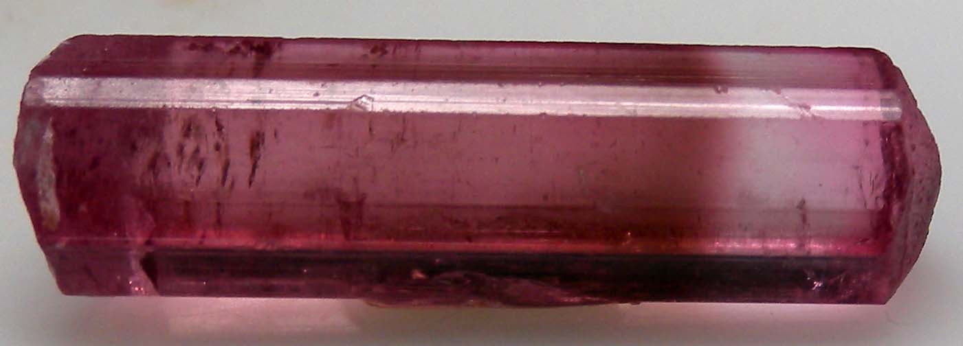 Transparent, color-zoned red Tourmaline crystal from the Stewart Mine. Well terminated and undamaged. Gem quality from top to bottom. Ex. Neil Levett collection with his sticker affixed to one side of the crystal. Weighs 3.63 grams.