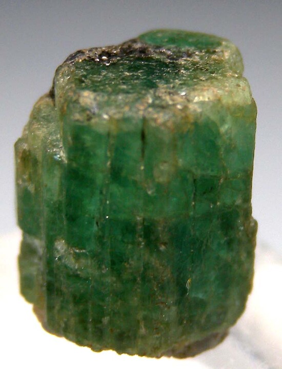 Terminated single Emerald crystal from Brazil. Deep green and translucent with some attached Biotite. Appears to be doubly-terminated too!