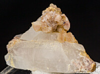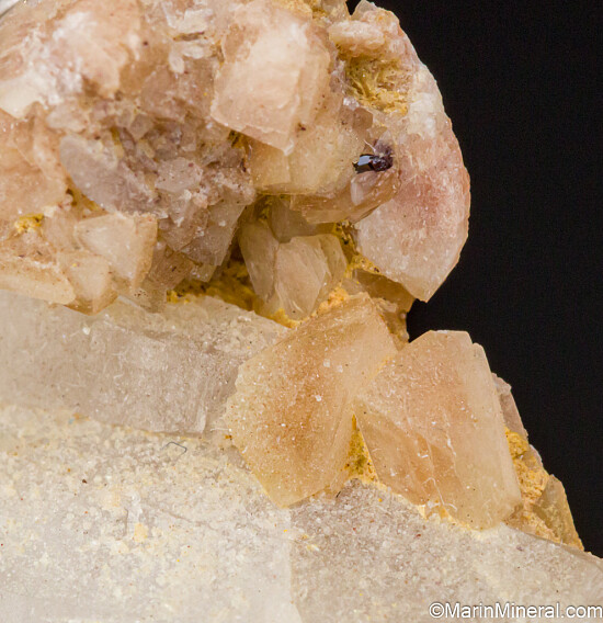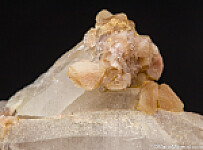 Tan crystals of Woodhouseite on Quartz crystals from the Champion Mine in California. The crystals are sharp and reach 4mm in size. The Champion Mine is a former andalusite mine located in the White Mountains of eastern California and first operated in 1922. This is the Type locality for Woodhousite.