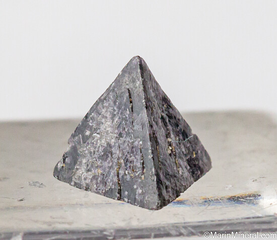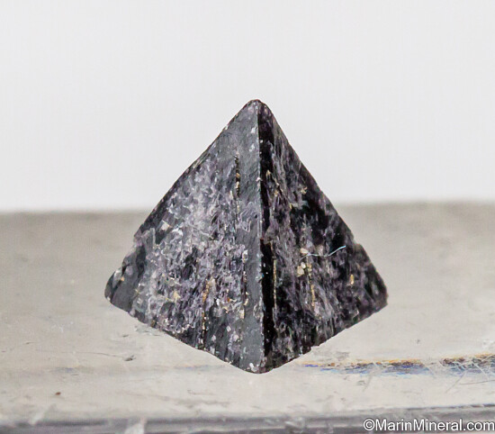 Complete and undamaged tetrahedron of Chambersite, a rare mineral found in salt formations in a small number of localities worldwide. Dark purple in color with sharp, pointed tips. Collected by Fred Pough in 1970. Ex. Chuck Trantham collection. Valued at $150.