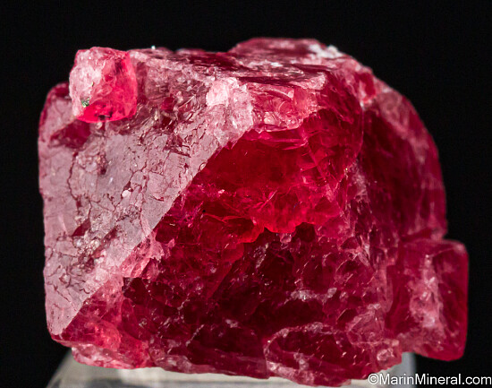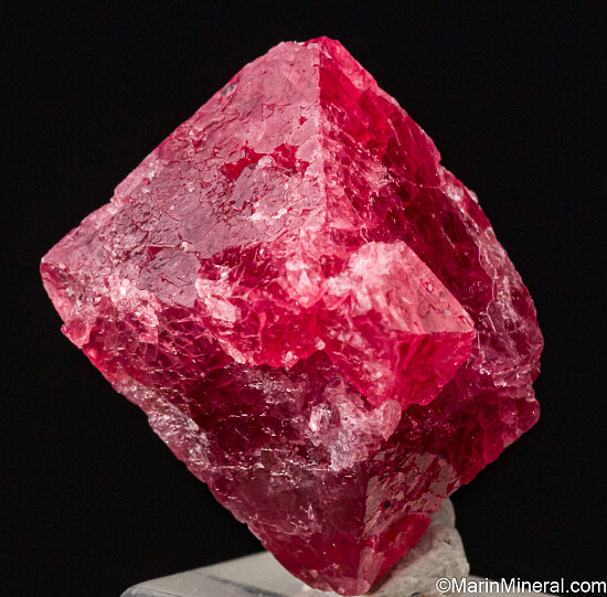 Translucent red Spinel crystal from Mahenge, Tanzania. Single octahedral crystal with small attached crystal and good well saturated pure red color. In 2007 spinel was discovered in a large marble massif near the town of Mahenge. The best quality have a very saturated hot pink to pure red color without secondary brown overtones, making them highly valuable as gemstones. Therefore, good crystals are often destroyed for their gem value. This is a good crystal specimen that survived the gem industry.